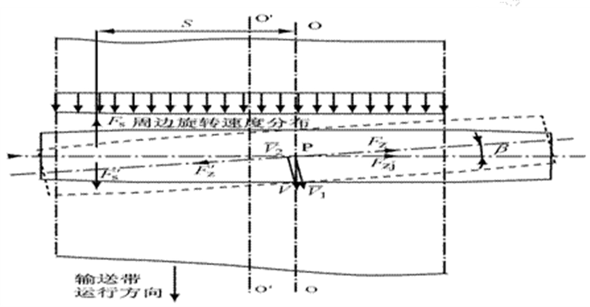 假設(shè)輸送帶向左側(cè)跑偏,如圖所示,輸送帶接觸到托輥?zhàn)筮呭F體部分后,因錐體周邊速度與托輥中央速度有一定的速差,托輥給輸送帶一個(gè)滑動(dòng)摩擦力Fs ,同時(shí)輸送帶給托輥一個(gè)反作用力Fs ′, 它與中央樞軸間存在力臂S , 使?jié)L筒受到一個(gè)旋轉(zhuǎn)力矩M :